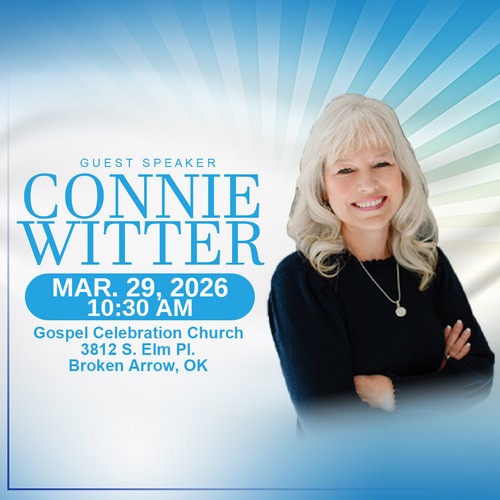 Connie will be the guest speaker at Gospel Celebration Church on Sunday morning, March 29, 2026 at 10:30 AM. The church is located at 3812 S. Elm Pl. Broken Arrow, OK